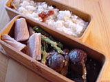 せつめい: 塩豚、いんげんの胡麻和え、ナス(畑)の田舎煮、自家製梅干です。おやつはなしです。