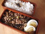 せつめい: マーボーナス(畑のなす、自家挽き肉)、ゆで卵、自家製らっきょう、青唐辛子(畑)の味噌佃煮です。おやつはメープルシフォンです。