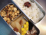 今日は木のお弁当箱は、penchan用。もう、このお弁当箱では金属っぽくってつくる気なくなっちゃう。。。 クロワッサンは、昨日はじめてうちで焼きました。まさに、パイ生地をつくるときとおんなじ工程。日曜の朝11時からはじめて、1時間おきくらいにめんどうをみて、途中なんども寝かせながら、できあがったのは8時半くらい。あ〜・・・。(それでお弁当は手抜き・・・)でもとっ〜てもおいしいね〜。2人で、オーブンから焼き立てのところをつまみぐいしたのでした。