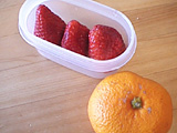 卵焼き、菜の花(畑)の辛し和え、自家製皮の餃子、自家製梅干です。おやつはいちごとみかんです。