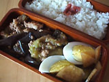家の畑でとれたなすと家で挽いた豚肉のマーボーナス、ゆで卵、きゅうりと大根の醤油ベース漬け、自家製梅干です。おやつは自家製バターのブルーベリーマフィンです。