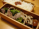 ブロッコリーと牛肉の粒マスタードとソースいため、しめじのバター焼き、自家製醤油味らっきょう、自家製梅干です。おやつはクルミミニパウンドです。
