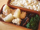大根と鶏ひき肉団子の甘煮、ひじきとにんじんの煮物、春菊の辛し和え、5分付き米です。おやつはプリンです。