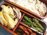 せつめい: かぼちゃの天ぷら、蒸し豚と高菜の炒めもの、いんげんのごまあえ、大根とにんじんときゅうりの醤油ベース付け、炒めじゃこと自家製梅干しの果肉の混ぜご飯です。おやつはブルーベリーマフィンです。