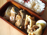 さばの自家製味噌煮(中落ちのところもスプーンでこそげて)、自家製納豆の薄揚げ詰め焼き、ゆでたまご、自家製梅干とすりごまです。おやつはヤッパプです(韓国の薬膳おこわ)。