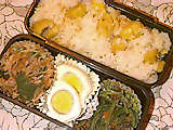 せつめい: 左から、肉野菜炒め、ゆでたまご、ほうれん草のおひたしおかかあえです。ごはんはくりおこわです。