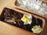 せつめい: 牛肉とごぼうのうま煮、とんぽーろー味の花ゆで卵、しいたけと昆布の自家製佃煮、自家製白菜漬けです。おやつは自家製ラムレーズンのケーキです。