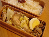 せつめい: 茹で豚とキャベツの炒め物、ゆで卵、自家製梅干です。おやつは白焼きあんぱんです。
