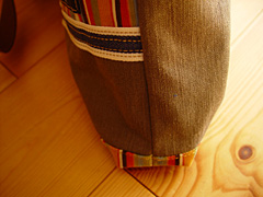 下底の別布部分には、以前に帽子のつば用にと買っておいた接着芯2種類のうち、薄いほうをはってみました。服地用の接着芯から考えたらかなりの厚地なので、底がしっかりしました。ほんとはマチのないパターンなのですが、マチをつくりました。これで本がたくさん入るねー。 |