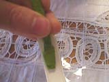 | リボンで巻きます。 リボンのはじをもっています。 |