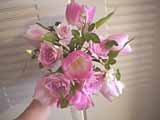 | 本のやりかたにしたがって、それぞれの花を配置、後ろでひとつにワイヤーでまとめます。 | フローラルテープをまいてひとつにまとめます。 |
