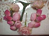 チューリップの間にピンクのミニバラを均等に入れてみました。まだ組んでハートリングの上においてみただけです。 |